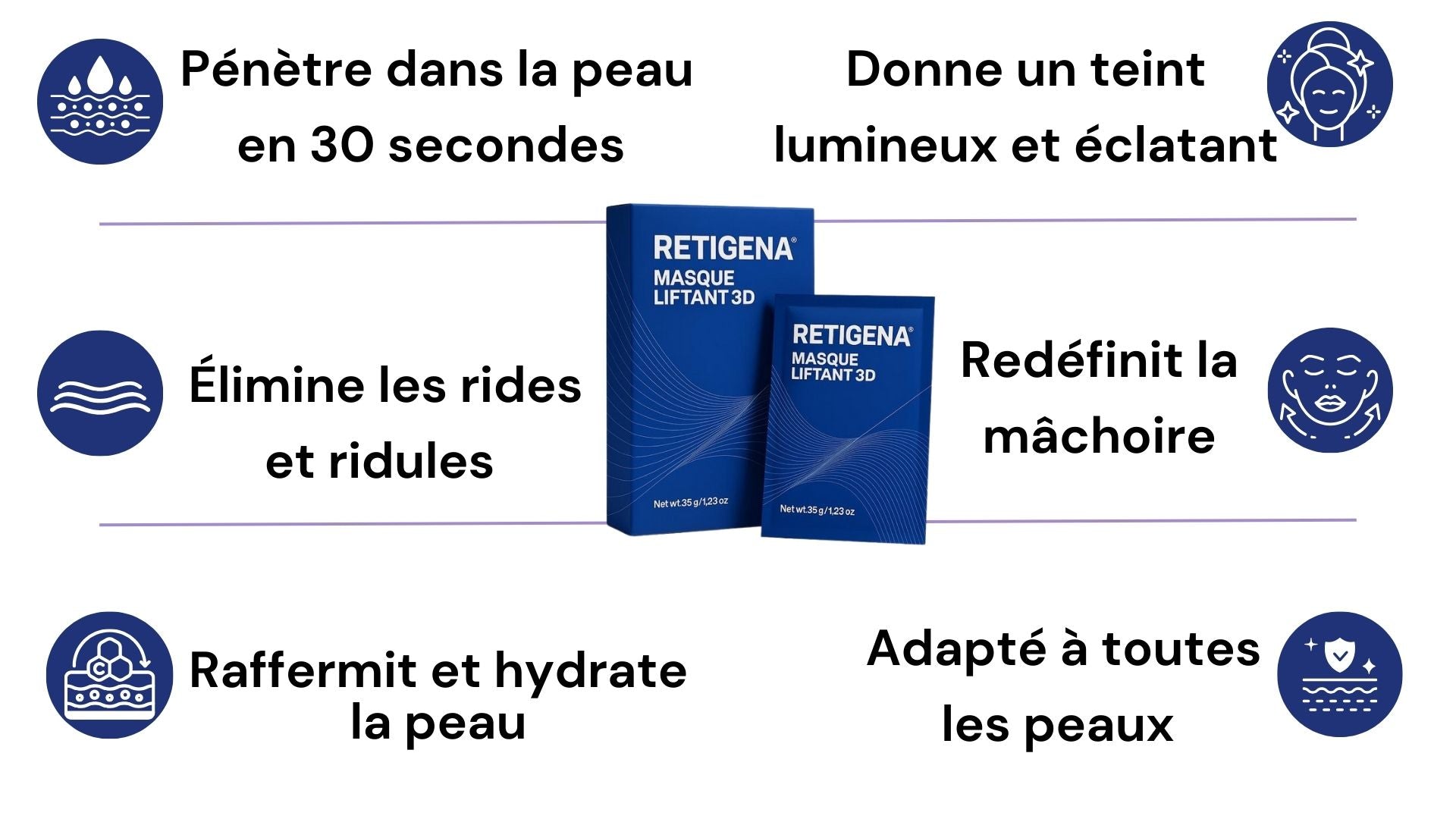 Les rides autour de la bouche et le relâchement du visage étaient mon plus gros complexe. Avec Retigena, en 2 semaines j'ai vu une amélioration visible. Les sillons nasogéniensse sont lissés, les joues sont plus rebondieset ma peau est plus ferme. Levisage a retrouvé du volume. Le masqueadhère parfaitementet c'est facile à utiliser.Excellent produit,je suis satisfaite de mon achat !