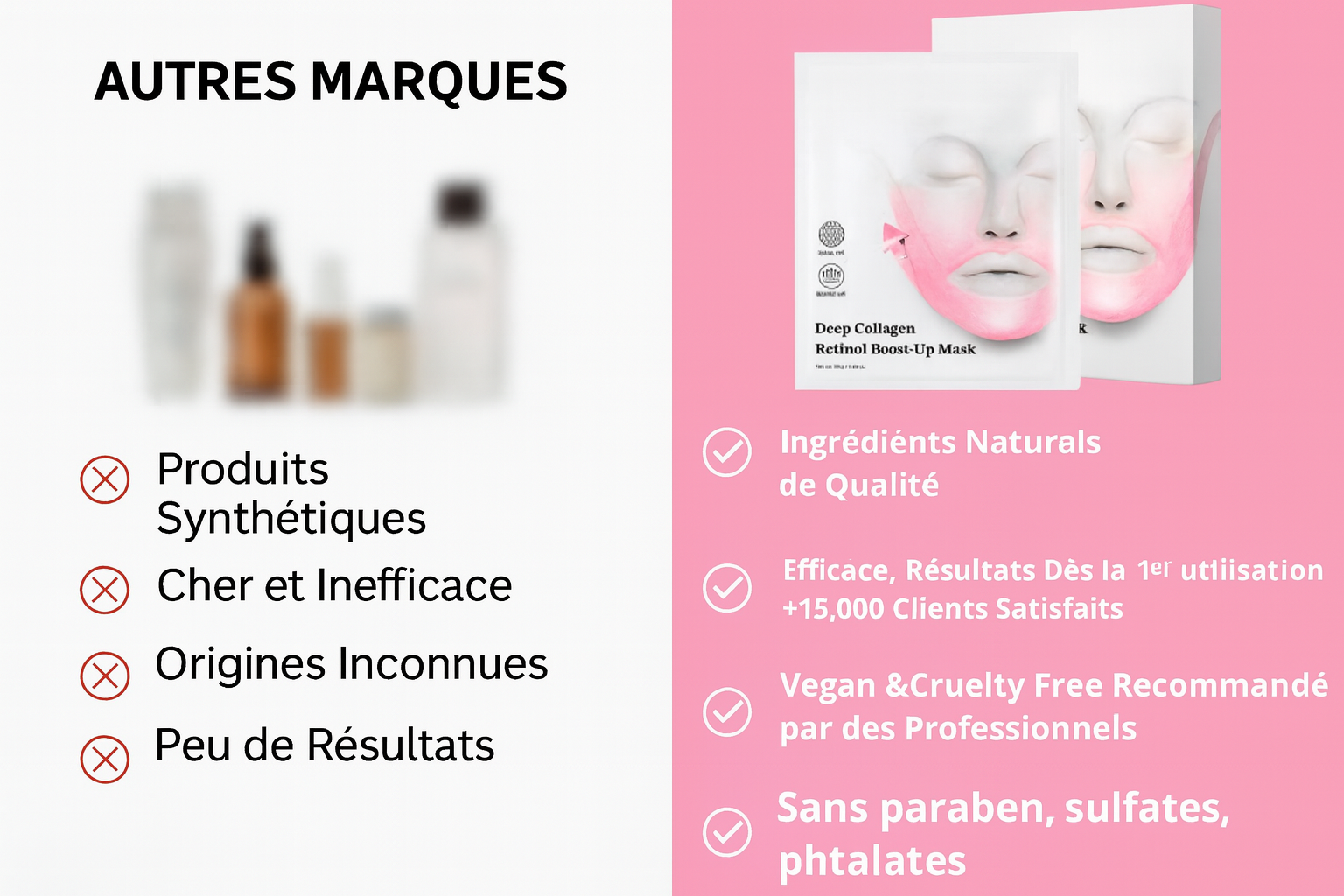 Mes poches et rides autour des yeux me vieillissaient de 10 ans (photo de gauche). Après 2 semaines avec ce masque coréen : regardez la photo de droite, mes rides ont fondu ! J'ai hésité pendant 3 semaines en me disant 'à mon âge ça marchera pas'. Quelle erreur, ne perdez pas de temps comme moi, commandez maintenant